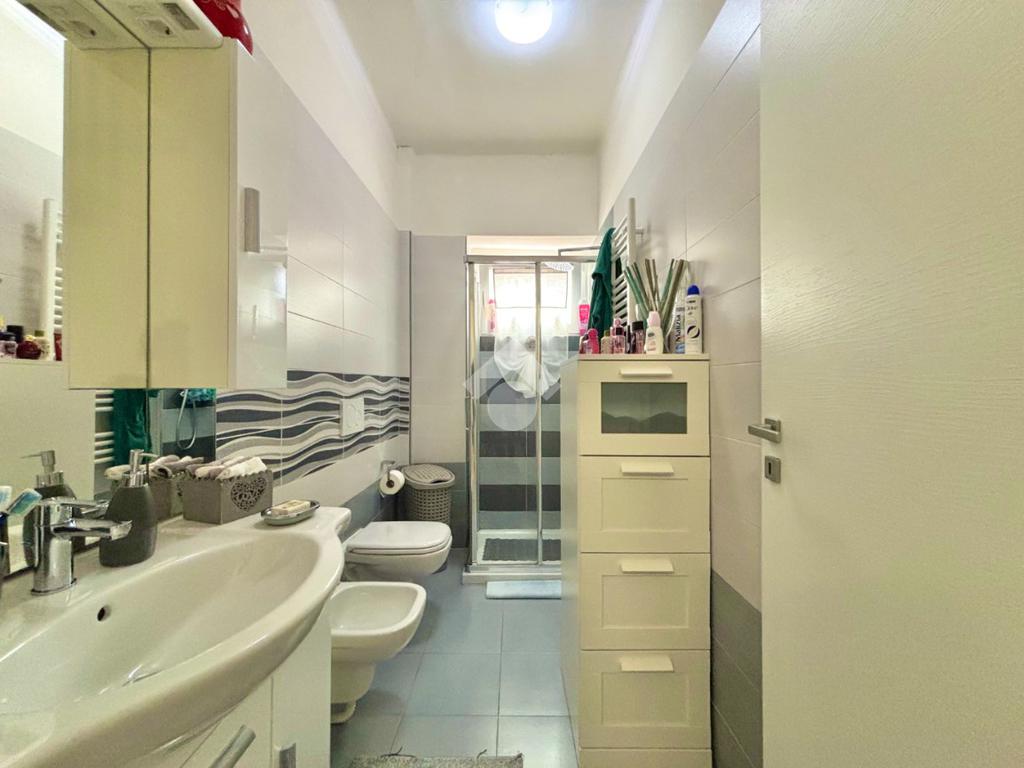 Il bagno, anch’esso completamente rinnovato, è dotato di sanitari sospesi, ampio box doccia e finestra, offrendo praticità e luminosità. Il sistema di riscaldamento è stato aggiornato con termosifoni in alluminio di nuova generazione, ideali per garantire un’elevata resa energetica.